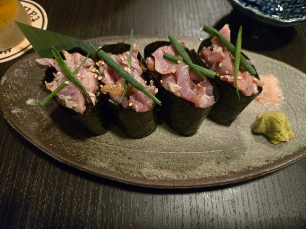 炙り肉の軍艦巻き、地鶏もも焼き、月見つくね串をいただきました。